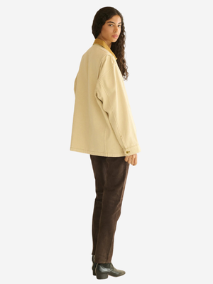 The Pascual Jacket by DEN recalls 1940s barn jackets and is reminiscent of a vintage style worn by Margaret and Katherines father. The jacket features a slouchy, relaxed fit, corozo buttons, a contrast corduroy collar, and an inner cuff detail. For added utility, there are two roomy hip pockets, as well as a chest pocket. Product Details: Designer ID: 15425092STR Color: Straw Composition: 100% Cotton Type: Jackets Imported.