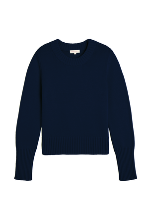 Long-sleeve crewneck sweater. Elongated ribbings at cuffs. 100% cotton. Photographed in size small.