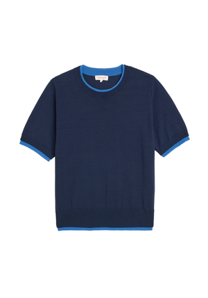 Short-sleeve crewneck sweater with contrast trim attached at bottom hem, neckline, and cuffs for a "double layer" effect without extra weight. 100% fine mercerized cotton Photographed in size small. S: Body length 22" Chest width 20" Factory: Hongkong Fabrication: Fine Mercerized Cotton