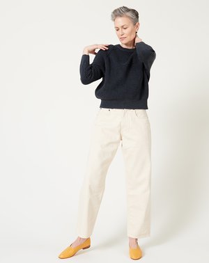 Demylee Chelsea Sweater in Black washed cotton. Classic crewneck sweater features angled shaker stitching, raglan sleeves, and ribbed edges. Fit: True to size Material: Cotton Origin: China Care: Gentle wash Model: Shayna (5'9", 27" waist, 36" hip, 34A) wears size Small Why we Covet: Powerfully simple luxury Shown here with: 6397 Skater Jean in Natural, Martiniano Glove in Corn