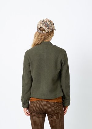 MJ. Watson's Cashmere Wool Jacket features a button front and two patch pockets. Details: - Six button front. Long sleeves. - Two flap patch pockets. - Small stand collar. - Hand wash cold. Line dry. Dry clean. - Made in Italy. Color olive. 90% wool, 10% cashmere.