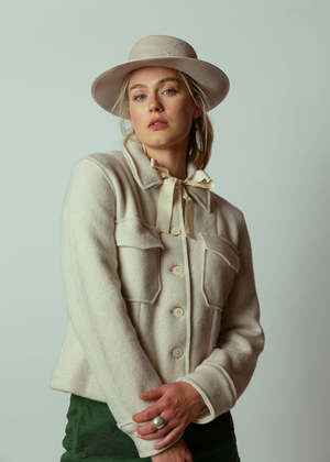 MJ. Watson's Felted Wool Jacket features a button front and two patch pockets. Details: - Six button front. Long sleeves. - Two flap patch pockets. - Small collar. - Hand wash cold. Line dry. Dry clean. - Made in Italy. Color natural. 60% wool, 40% polyester.