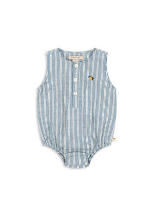 Romper made in a soft seersucker fabric. Practical design with convenient push buttons at the leg openings that make changing your baby easier. Made from 100% organic cotton.
