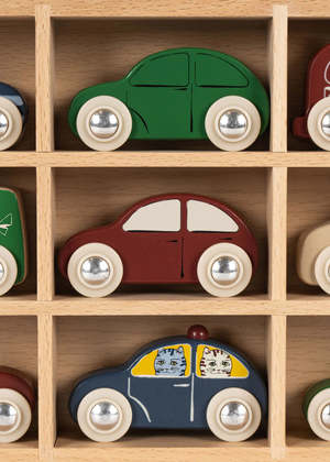 Box with nine wooden cars for hours of fun and play. This product is made of FSC-certified beech wood and MDF. Suitable from 18m+