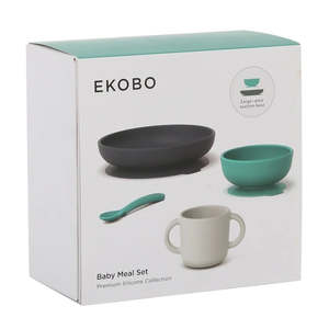 Ekobo is an Eco-friendly company established in 2003 dedicated to designing and manufacturing contemporary home accessories made from a natural and renewable resource: Bamboo. - Four piece baby meal time set - Made from premium food-grade silicone - The set includes a bowl, plate, cup and spoon - The sturdy bowl and plate with have a suction system to keep dishes firmly in place on almost any surface - Two handle training cup, to help transition from bottle while protecting baby's developing teeth - The ergonomic soft tip spoon is designed for first foods and baby-led weaning Made from premium food-grade silicone. Free of BPA, PVC, Phthalate & Latex, Microwave, oven and freezer safe silicone (-40C to 230C / -40F to 450F), Dishwasher Safe, 100% reusable Care: Don't use sharp knives on silicone dishes. Silicone spoons are soft and safe eating utensils for weaning babies and up with supervision at meal times. They are not teethers, nor chew toys and can damaged from excessive biting or chewing. 89431