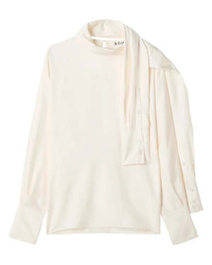 The Foulard Silk Top in White by Rohe is an elegant, draped blouse crafted in pure silk featuring long sleeves and a sleeve-style scarf that can be wrapped around the neck for a scarf effect. - 100% Silk - Model is 179cm and is wearing a size EU 36