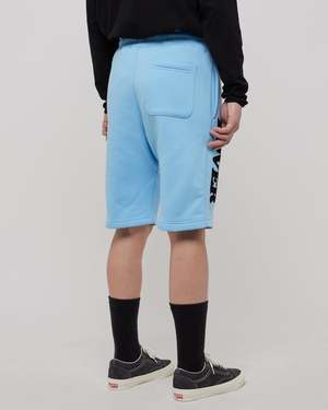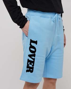 Bianca Chandn Lover Sweatshorts in Baby Blue & Black - Elastic waistband with drawcords. - Two slash pockets at front. - Textured Lover graphic down left leg. - Patch pocket on right seat. - Tonal stitching. - 100% cotton. - Made in USA. Lincoln is 6'0 weighs 155 lbs and is wearing a size Medium.