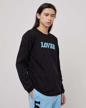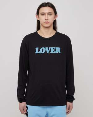 Bianca Chandn Lover L/S T-Shirt in Baby Blue and Black. - Rib knit crew collar. - Textured "Lover" graphic at left chest. - Dropped shoulder. - Relaxed fit. - Tonal stitching. - 100% cotton. - Made in USA. Lincoln is 6'0", weighs 155 lbs, and is wearing a size Large.