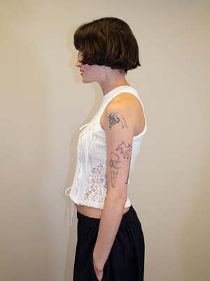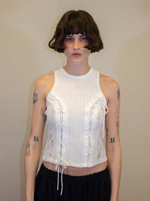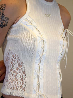 A fully knit tank top with lace side inserts, and lace up tie elements. Unisex.