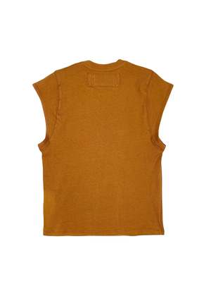 The Cut Off Tee in Khaki from Sebastien Ami. Details Box patch tag 4.5" 'sleeve' 100% 17 Oz. Ribbed Cotton Jersey Made in LA