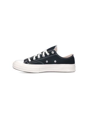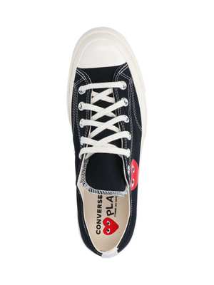 Unisex > Shoes > Sneakers Comme des Garons PLAY Converse Chuck 70 low sneakers in black cotton with round toe with contrasting white rubber detail, laces, red heart print on the side, and rubber sole. Composition: 100% Cotton
