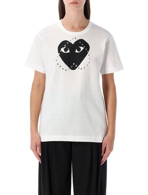 Unisex > Clothing > Topwear > T-Shirts This Comme des Garons PLAY white cotton T-shirt embodies the Japanese brand's signature blend of minimalism and playful creativity. Featuring a large black heart print with eyes and metallic stud detailing, it adds a bold, contemporary twist to a timeless silhouette. - 100% cotton - Crew neck - Short sleeves - Large black heart print with eyes - Metal stud detailing - Regular fit Alessandra is 1.75 m and wears size M. Composition: 100% cotton