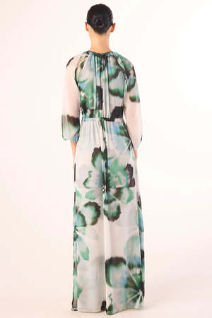 Perdita is an elegant maxi silhouette cut from verdant anemone-printed chiffon. Designed with a high neckline and back keyhole button closure, this trans-seasonal style features long billowing sleeves, a sweeping skirt with a side slit, and an adjustable tie waist for a flattering fit. Fully double-lined, its the perfect piece for all your special occasions. Made in the USA. Dry clean. 100% Poly Chiffon. Model Measurements: Height 5'9.5", Waist 24", Bust 32", Hips 36". Model is wearing size XS.