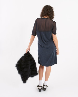 Mateo V neck Dress is a midnight Navy-colored easy t-shirt dress fit with a lightweight mesh for the sleeves and back panel. Fits true to size.
