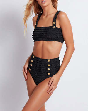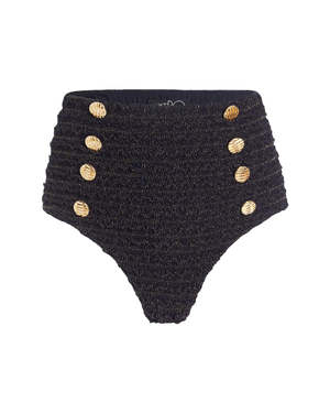 The Crinkle Lurex Bikini Bottom in Black by PatBo is a high waisted, button front bottom featuring gold buttons and waterproof, knit fabric. - Made in Brazil. - 95% Polyamide 3% elastane 2% Polyester. - #HOT26779US.