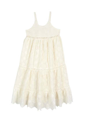 Achieve the perfect mommy and me style with this adorable kids' version of LoveShackFancy's Scarlett Dress. Crafted from sweet soft cotton with a babydoll silhouette, eyelet embroidery, and a shirred bodice, featuring skinny straps with tiny floral lace trim. - Color: Ivory Embroidery - 100% Cotton - Made in India - Hand Wash Cold- Style #: GD014 228 Productcode LSFKPF8-2 Designer LOVESHACKFANCY KIDS