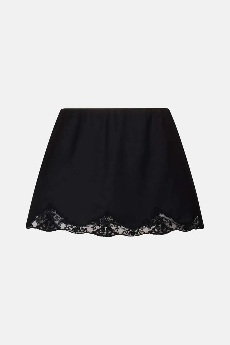 Our Belve Slip Mini Skirt is crafted from lightweight sheer fabric in a fitted A-line silhouette, finished with a scalloped floral lace hem for a flirty finish. - Color: Black - Details: Fitted mini length, mid-rise, lightweight sheer fabric, A-line silhouette, scalloped lace hem - Composition: 100% Polyester - Care Instructions: Dry clean only - Style #: S1056-3133 - Type: Skirts