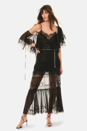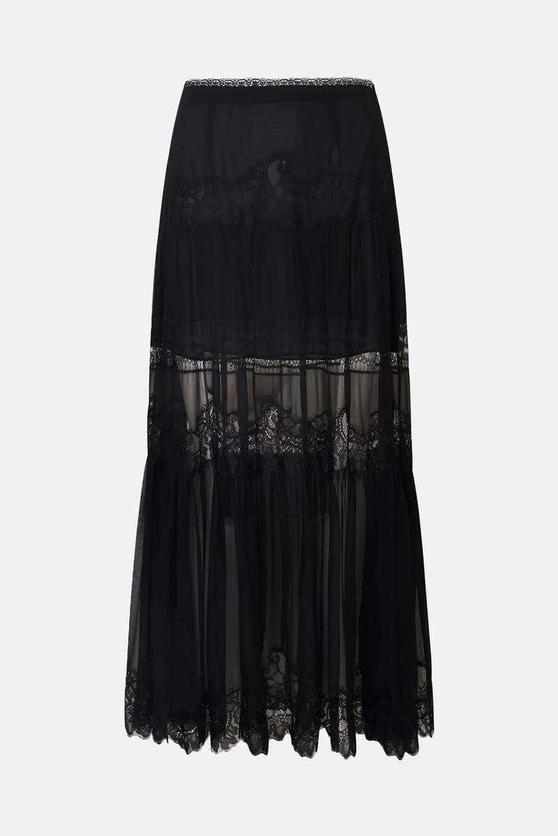 Our Aureline Silk Lace Pleated Maxi Skirt features a sheer pleated construction with a fitted high-rise waistband and three flowing tiers, each edged in delicate lace with a soft ruffled hem. - Color: Black - Details: Three-tiered skirt, sheer pleated construction, fitted high-rise waistband, lace-trimmed tiers, ruffled hem with floral trim, invisible side zip closure - Composition: Shell: 100% Silk, Lining: 100% Polyester - Care Instructions: Dry clean only - Style #: LS936-3311