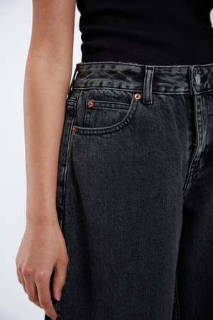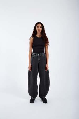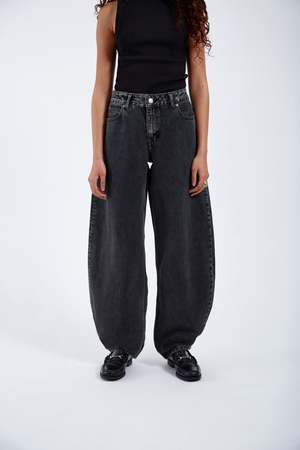 Relaxed fit Mid waist Barrel leg Classic 5-pocket Zip fly Rigid (no stretch) denim fabric Made in Pakistan 100% Cotton