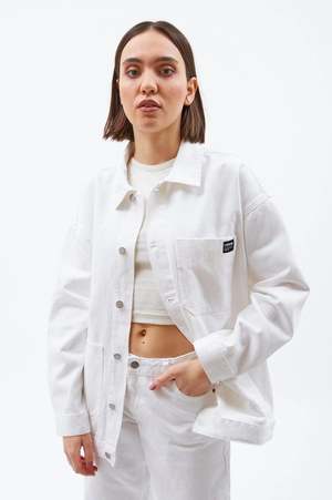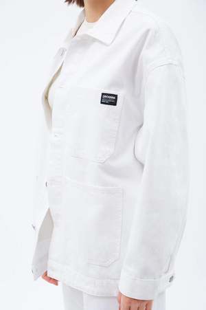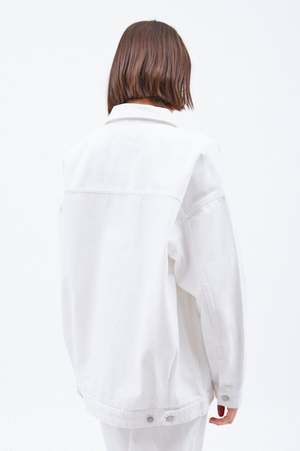 Oversized denim jacket with dropped shoulders and classic worker-style detailing. The model is 176 cm and wears a size S.