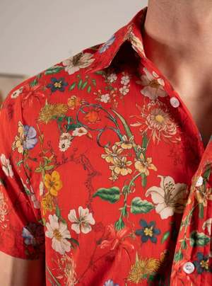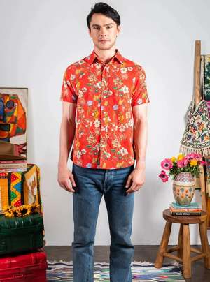 Dushyant shirts have a cult following, they're the best! Lightweight and perfect for year round wear. Due to the labor intensive nature of the hand block-printing process, these shirts are made in small batches, and never mass produced. This print is inspired by Jacobean era French floral art! Fit Note: Please refer to the sizing chart below for details - Tailored Fit. Fits true to size - Get your normal size for a fitted look - Size up for comfort fit Fabric Details: - Natural Dyes ONLY. Only vegetable and plant dyes were used to print this fabric! - Color: Red and multi-colored floral print - Fabric: 100% Ultra-soft Hand Block-Printed Cotton - The fabric is entirely HAND BLOCK-PRINTED using traditional wax batik printing techniques. Inconsistencies in the print are a feature of the hand-printed nature of the fabric. Sizing (in inches): - Small - Shoulder: 16.75, Chest: 40, Shirt Length: 28.5 - Medium - Shoulder: 17.50, Chest: 42, Shirt Length: 29.5 - Large - Shoulder: 18.25, Chest: 44, Shirt Length: 30.5 - Extra-Large - Shoulder: 19, Chest: 46, Shirt Length: 31.5 Care Instructions: - FIRST WASH: For the first 2-3 washes, please wash this shirt by hand, or separately by itself. This is hand-dyed and will bleed color. - WASH: After the first 2-3 washes, you can machine wash the shirt in cold water with like colors. - DRY: Please hang dry or line dry the shirt. Please do not use the dryer. - IRON: Warm iron, as needed. Model is 6', 170 lbs, wearing size M. NOTE: The actual color of the shirt may differ slightly from the pictures due to computer lighting and the hand-made nature of the fabric. This shirt's color matches the first image best.