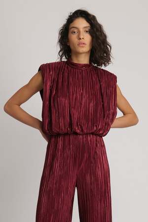 description: Pleated knit with sleeveless top with shoulder pads, featuring a round neck with unique gathering detail, and elastic waistline with matching ties. fabric: 100% Polyester Hand wash Made in Israel