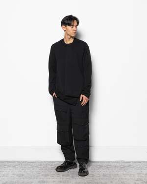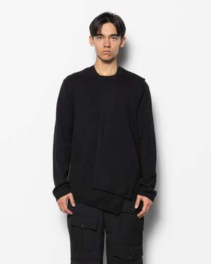 This relaxed sweater is designed with an asymmetrical overlay that drapes across one side of the sweater, creating a deconstructed aesthetic. Crafted from soft Japanese wool, it features an asymmetrical hem. - 100% Wool. - Made in Japan. - Hand wash only, line dry. - Style number: PP-N012-051. Issac is 60 (183cm) and is wearing a size M.