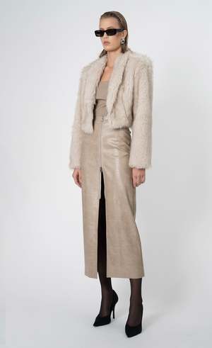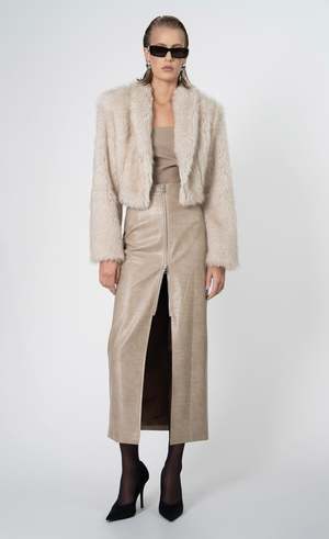The Uma Fur Jacket is a cropped faux fur staple piece. It is made from a lux soft and fluffy fabric. Made to keep you warm, yet stylish during the colder months, the cropped style makes it easy to wear and throw over any outfit. Model is wearing size XS. Runs cropped, fits true to size. Material care: 100% Faux Fur. Lining: 97% Polyester, 3% Spandex. Gently steam the fur in a downward motion to help the hairs settle uniformly in the same direction.