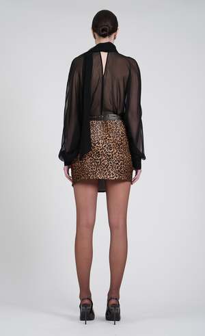 The Blaine Skirt is a leopard-spotted mini crafted from 100% cowhide leather. Designed in a wrap silhouette with an adjustable belt and gold hardware, it brings a touch of texture and print to any look. A timeless statement piece youll reach for season after season. Model wears size small. Runs true to size. Model is 5'8". 100% Cowhide Leather. Made by hand in Colombia. Dry clean only.