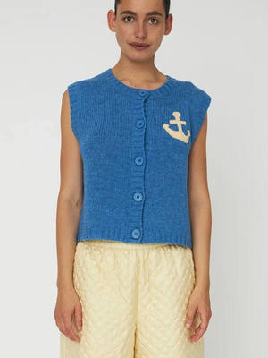 The Stella Nova Anchor Vest features a beautifully embroidered design, adding a playful touch to any outfit. With its round neck and button-up front, this cropped cable knit is a perfect spring wardrobe staple. Pair over a classic white T-shirt with slouchy jeans for a relaxed everyday look. The model is 176 cm tall and wearing a size EU S. Details - Cropped cable knit - Round neck - Button up - Embroidered patch Composition: 80% Wool (RWS), 20% Polyamide (recycled). Care: Hand wash only. Do not tumble dry. Iron on low.