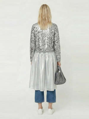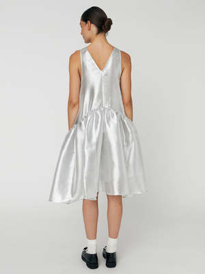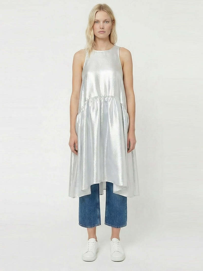 This sleeveless midi dress is crafted from a lightweight, subtly sheened fabric for an elegant finish. It features a round neckline at the front, a V-neck at the back, and a loose silhouette with a gathered waist seam that adds gentle volume to the skirt. Made from a delicate fabric, this dress requires extra care. Keep away from sharp objects, as the surface is fragile. Loose threads or sequins are part of the fabrics delicate nature and are not considered defects. The model is 176 cm tall and wears size EU 36. Details - Sleeveless - Round neck - Gathered waist Fabric & Care Composition: 65% Polyester, 35% Polyamide; Lining: 100% Viscose Care: Hand wash only. Do not tumble dry.