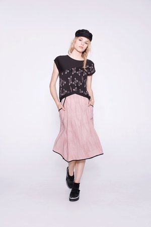 Medium fluid skirt Tie and dye fabric Two pockets on the sides Stripe at the pockets and bottom Length below the knee Made in Montreal dusty pink with black detailing at pockets and hem 100% rayon Hand wash - Dry flat