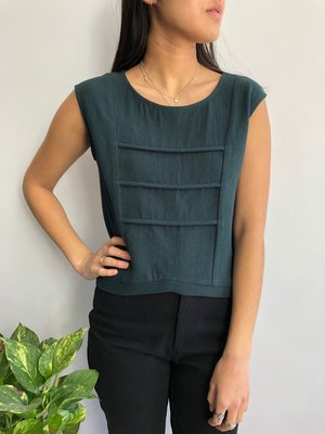 Sleeveless top - Soft and very light fabric - Embossed fabric on the front - Round collar - V-cut in the bottom Made in Montreal 70% viscose - 30% linen Hand wash - Dry flat The model is 5'6" tall and is wearing an XS. Made in Montreal.