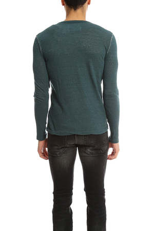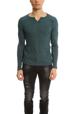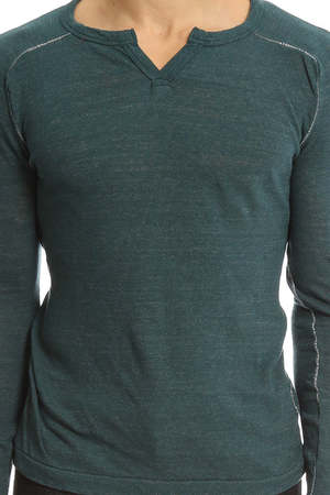 Unique air-knit style fabric with a little give but still styled for close to the body wear. Slight slit for exposing and giving some room at the neck making this a stylish alternative to a deep statement V neck. - Color: Green Ink - 80% Cotton 20% Nylon - Style #: 151470 - Made in Japan - Machine Wash Cold * Model is 6'1" wearing size Medium Productcode VRMF4-2 Designer V::ROOM