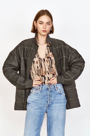 - Hand embroidered kantha stitch detail - Light quilting - Lined in cotton - Pockets - Button placket - Cotton silk blend outer; lined in 100% cotton; poly fill - Made in India