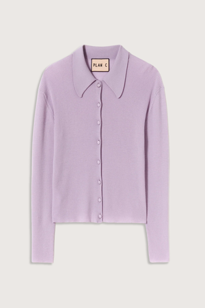 Wisteria ribbed knit long sleeve cardigan in lightweight merino wool with a shirt collar and covered buttons. - 100% merino wool - Made in Italy - The model is 178 cm tall and is wearing size 40.