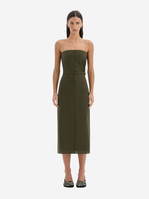 The Sorel Strapless Midi Dress by SIR. is crafted from a form-fitting nylon blend with a technical hand feel. It features tucks through the body for subtle shaping, a central seam detail, and beaded accents at the side waist. Product Details Designer ID: SIR126-1010 Color: Dark Olive Composition: Main: 18% Nylon 82% Cotton; Lining: 100% Polyester Imported.