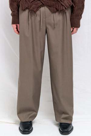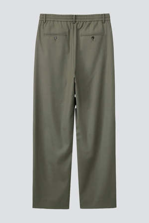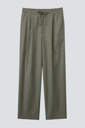 Khaki Lounge Wool Slacks from Dunst. Crafted from a wool/polyester blend. Features an elastic waistband with drawstrings and a single pleat, with a relaxed, tapered fit. - 70% Polyester / 30% Wool