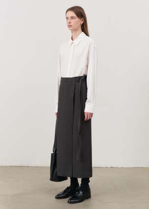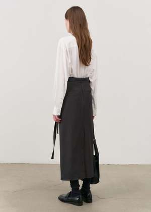 The skirt features a straight, maxi-length silhouette with a wrap construction of a soft poly-blend twill. The waist band is fitted with belt-loops, concealed button fastenings, and an extended self-tie strap for a fully adjustable fit. The skirt is complete with side pockets and a rear vent for accessible everyday wear. 64% polyester, 32% rayon, and 4% polyurethane. Model is 5ft 8" and wears size S.