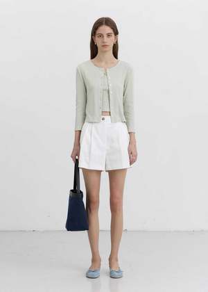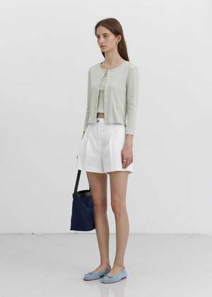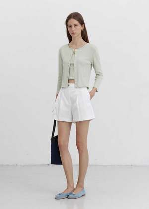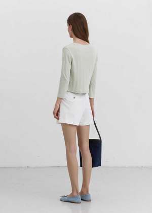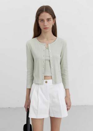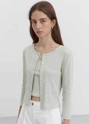 This crewneck cardigan is offered in a seasonal cotton pointelle, with a cropped fit and shortened sleeves. The top is complete with mother-of-pearl buttons, a small embroidered logo2 at the front hem, and picot trim at the neck. 100% cotton. Model is 5ft 8" and wears size S.