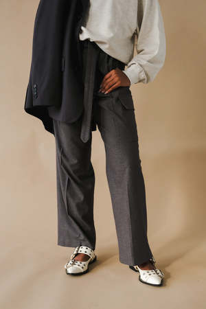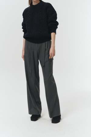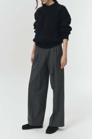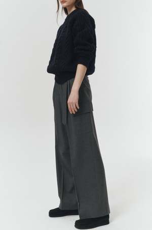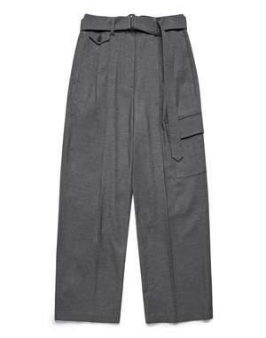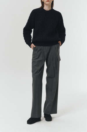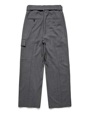 Dunst wool Baker cargo trousers in charcoal grey. 65% polyester, 17% wool, 15% rayon, 3% polyurethane.
