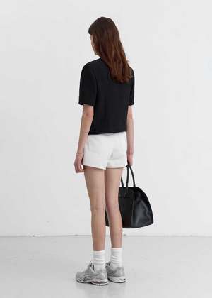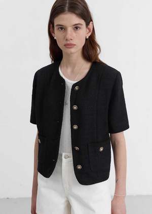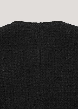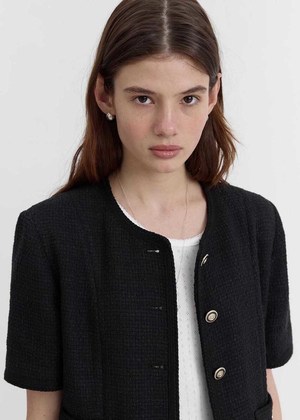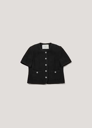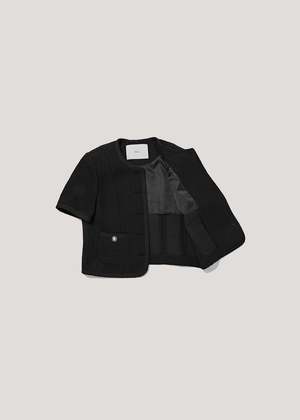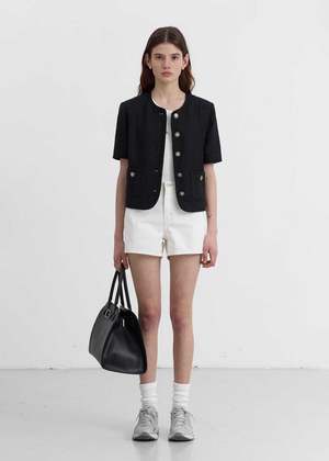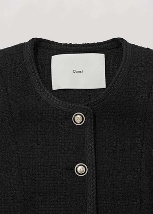 The tweed line returns from DUNST, accommodating for warm weather with a lighter cotton blend tweed knit with a short boxy, short silhouette, refined with light shoulder padding. The jacket also features a light poly lining, two front patch pockets, and metallic buttons throughout. 54% cotton, 26% polyester, and 20% acrylic. Model is 5ft 8" and wears size S.
