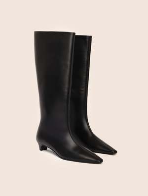 Handmade in Elche, Spain. The Novelda Boot features a blade heel, high shaft, pointy toe, and a demure look. Dimensions: - Heel height: 1.5 inch (3 cm) - Shaft length: 15.8 inch (40 cm) - Shaft opening: 7 inch (18 cm) Materials: - Upper: 100% leather - Lining: 100% leather - Outsole: Synthetic
