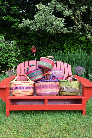 Artisans in the Bolgatanga region of Ghana weave these beautiful, durable baskets from colorfully-dyed elephant grass. A popular choice among green shoppers, busy mothers and picnic planners worldwide, Bolga baskets are made to be used, while remaining functional and beautiful for years. Sold singly in assorted colors and patterns. Each basket is unique. Dimensions: 18.5"L x 18"W x 18"H Crafted from: Elephant grass, dye, leather.