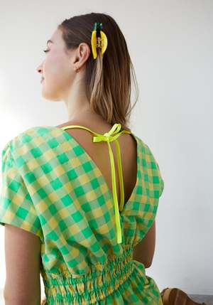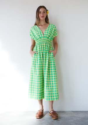 Flaunt your style with the Caricia Dress. Made with sophisticated, luminous fabric, this midi dress features a V-neck on both the front and back, elastic waist, and side pockets. The neon bow detail on the back adds a playful touch. Perfect for the fun and feminine fashionista!