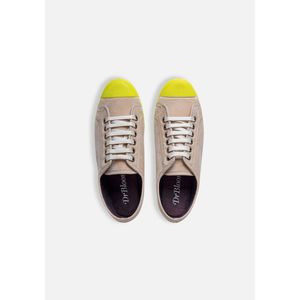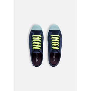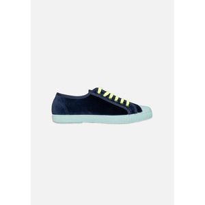 *SIZING: We recommend choosing one size larger than usual, since they are small. Colorful velvet sneakers for fall. Add a little pop to any outfit. Colors: -Night blue velvet with sky-colored toe sole. -Ecru velvet with neon toe soles. Contrasting neon colored laces. Made in Spain.