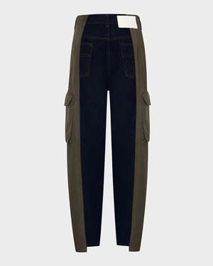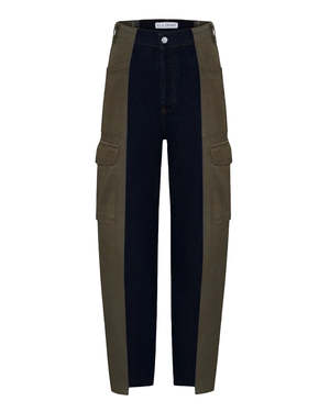 The Irenie Trousers Cargo by E.L.V. Denim is a high-waisted, contrast cut cargo and denim pant featuring functional cargo pockets, asymmetrical cut hems, middle seam detailing, and a lightly tapered fit. Handcrafted from rigid denim and classic cotton cargo trousers. Zip closure. Boyfriend fit. True to size. Size up for a more relaxed fit that sits lower on the hip. Song is 57 wearing size 27. Upcycled trousers are each one of a kind and may have slightly different characteristics than what is pictured. Care: Wash at 30C maximum. Air dry.