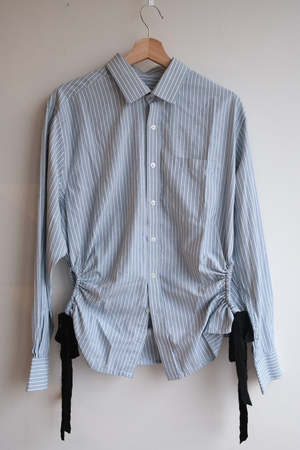 A classic reimagined. This one-of-a-kind vintage men's dress shirt is a modern update with side cutouts and an adjustable velvet tie that cinches the waist for a customizable fit. These velvet bungee shirts are custom made by Nena Hansen; the soft edge of the black bow adds contrast to the structured shirt. Crafted in Vancouver, Canada from vintage cotton or cotton-blend shirting, each piece is sustainably upcycledhonoring the shirt's original structure while redefining it with a fresh silhouette. Wear it loose for a relaxed feel, or cinch the ties to create shape and movement. Perfect layered or worn solo, this piece blends masculine tailoring with a feminine fit and contemporary edge. MATERIALS & CARE Made from a soft and lightweight cotton/poly blend. Cold wash gentle, tumble or hang to dry. SIZE & FIT Size L/XL. Each shirt is sourced from vintage menswear and may vary slightly in fit, fabric weight, and length. We recommend choosing your usual size for a relaxed fit, or sizing down for a closer silhouette. Because every piece is unique, minor variations in dimensions and structure are part of its character.