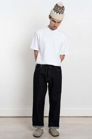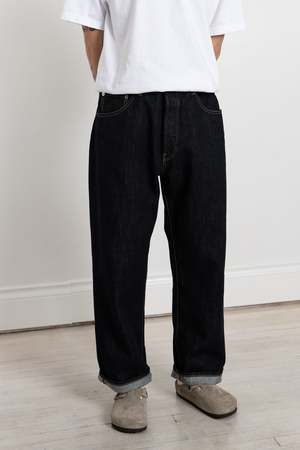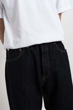 The wide tapered cut is HATSKI's widest fitting jean Cut from 15.6 ounce Japanese selvedge denim, which is thick and tightly woven yet soft with a slightly brushed texture Featuring a relaxed waist, and wide leg with a slight taper approaching the hem 100% cotton 15.6oz sanforized selvedge Japanese denim Button fly w/ hidden rivets Five pocket design Contrast stitching Silver hardware Debossed cow leather patch at rear Thick and tightly woven, yet soft to the touch Wide and baggy silhouette with a loose waist Made in Japan Unisex sizing 1 / S / Waist 39cm / Rise 31.5cm / Inseam 70cm / Thigh 33.5cm / Hem 22.5cm 2 / M / Waist 41cm / Rise 32cm / Inseam 71cm / Thigh 34cm / Hem 23cm 3 / L / Waist 43cm / Rise 32.5cm / Inseam 72cm / Thigh 34.5cm / Hem 23.5cm 4 / 2L / Waist 44cm / Rise 33cm / Inseam 73cm / Thigh 35.5cm / Hem 24cm 5 / 3L / Waist 45cm / Rise 33cm / Inseam 74cm / Thigh 36cm / Hem 24.5cm Zach is 5'10", 140lbs and wears size 1 / small Description tag The wide tapered cut is HATSKI's widest fitting jean. Cut from 15.6 ounce Japanese selvedge denim, which is thick and tightly woven yet soft with a slightly brushed texture. Featuring a relaxed waist, and wide leg with a slight taper approaching the hem. Made in Japan. Age group adult Gender unisex Color Indigo
