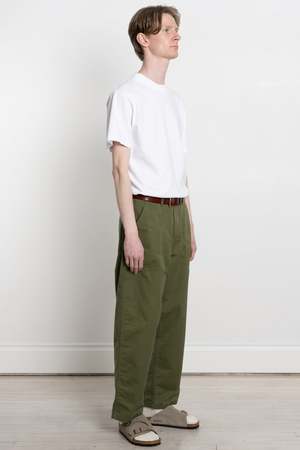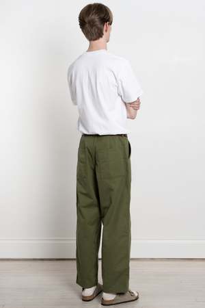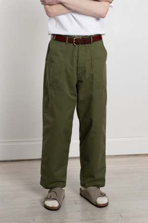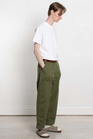 HATSKI's take on a classic military fatigue trouser Where the typical fatigue sees a rather straight leg, HATSKI has imbued this well known trouser with its signature proportions - a looser fitting top block that tapers gently towards the hem Cut from the traditional reverse sateen cotton, they are suitably crisp with a tightly woven texture 100% cotton Two front patch pockets Two rear patch pockets Zip fly Belt loops Adjustable waist Unisex design Made in Japan Jesse is 6'1", 135lbs and wears size 2 Title tag Loose Tapered Utility Trouser Olive / Calculus Description tag HATSKI's take on a classic military fatigue trouser. Where the typical fatigue sees a rather straight leg, HATSKI has imbued this well known trouser with its signature proportions - a looser fitting top block that tapers gently towards the hem. Cut from the traditional reverse sateen cotton, they are suitably crisp with a tightly woven texture.